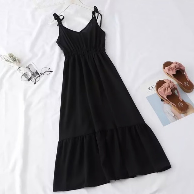 【即納】ショルダーリボン ウエストギャザーワンピース