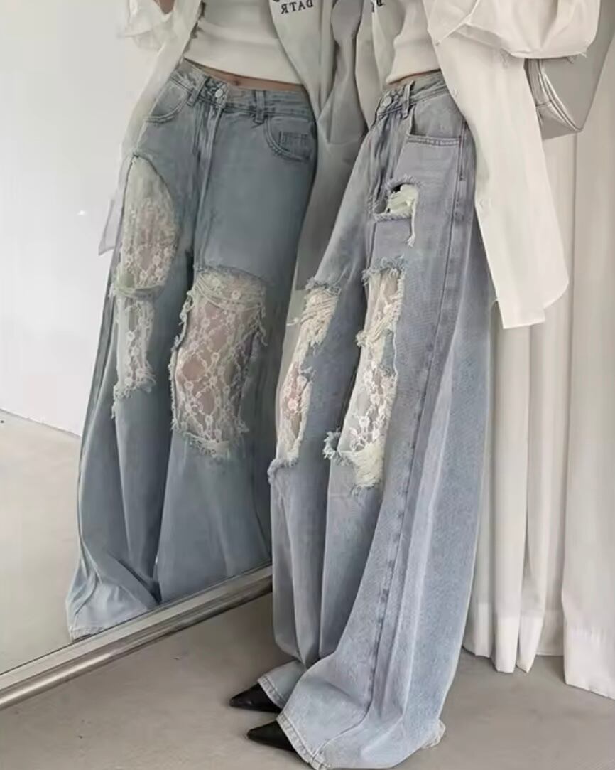 ダメージレースレトロデニムパンツ