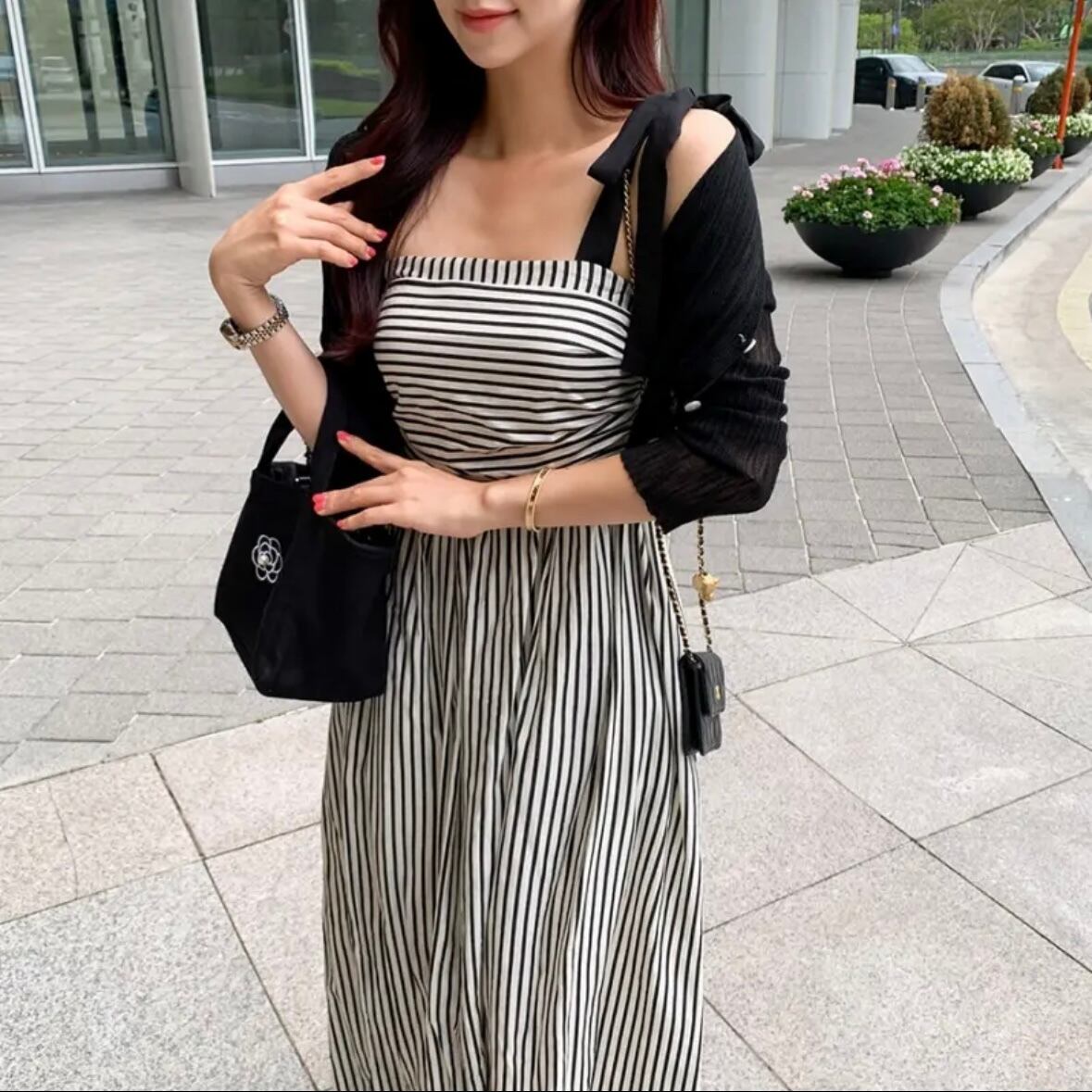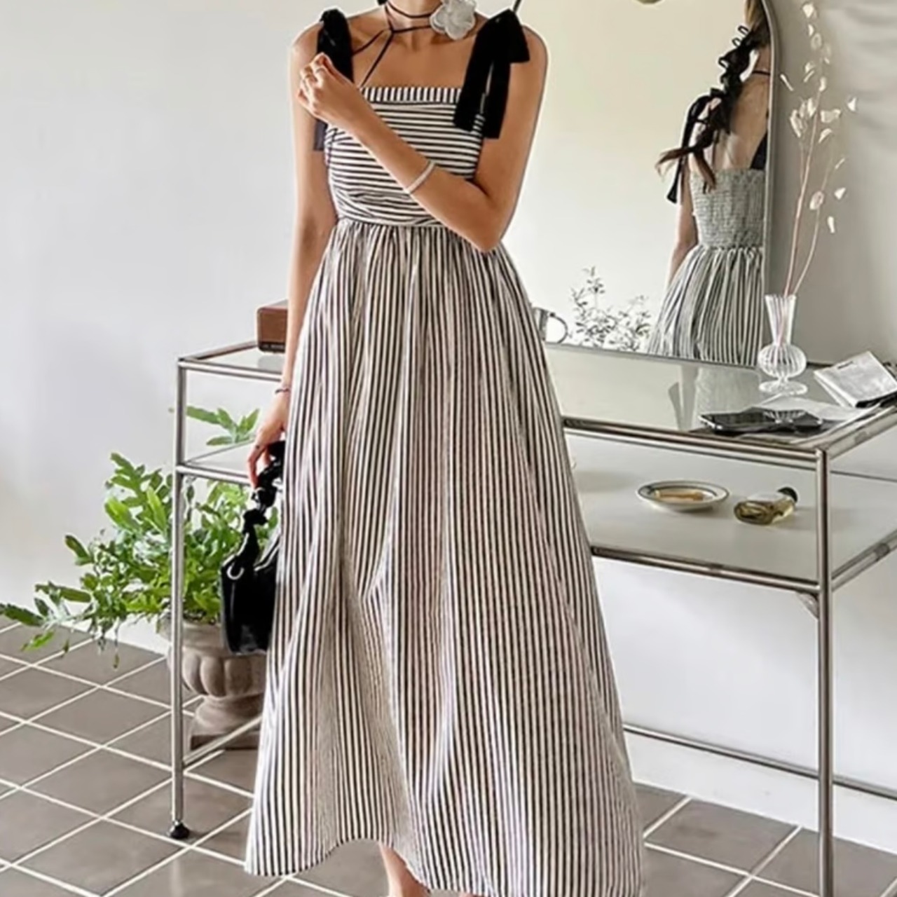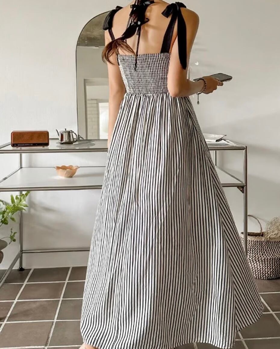 ショルダーリボン ストライプワンピース